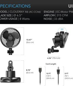 AC Infinity CLOUDRAY A6, Grow Tent Clip Fan 6” with 10-Speeds, EC-Motor, Weatherproof IP-44, Manual Swivel, Quiet Hydroponics Circulation Cooling