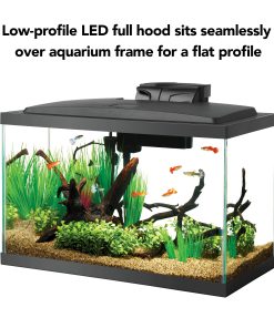 - Kit includes: glass aquarium, low profile LED hood, QuietFlow 10 power filter, filter cartridge, submersible preset heater 50W, premium fish food sample, water conditioner sample, fish net, thermometer and setup guide