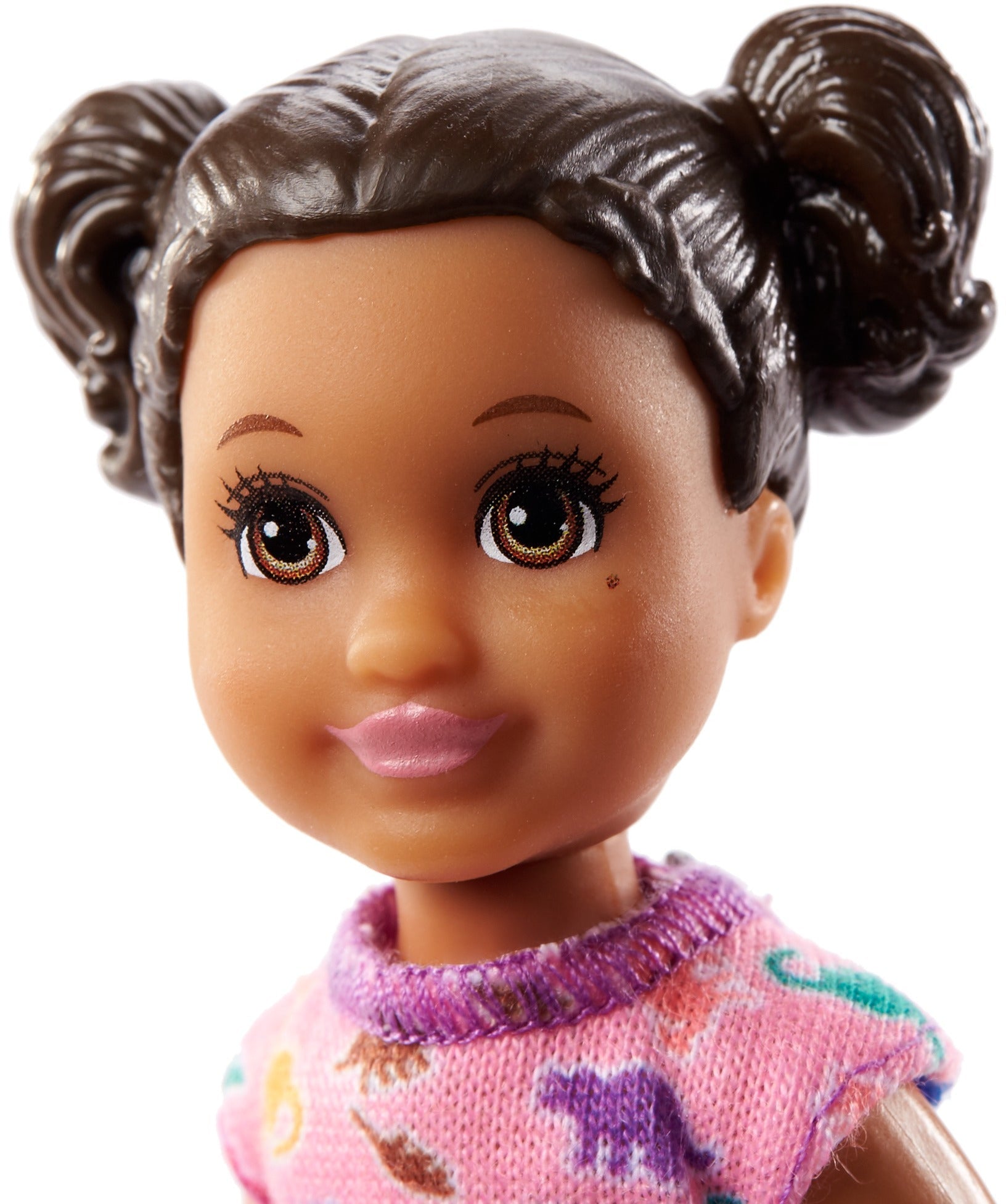 - The toddler doll wears a unique outfit as sweet as she is – a pink dinosaur-print dress, and shoes to match