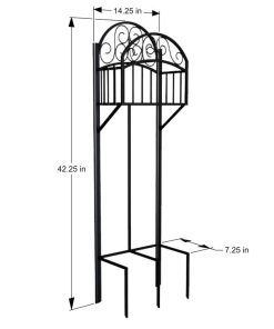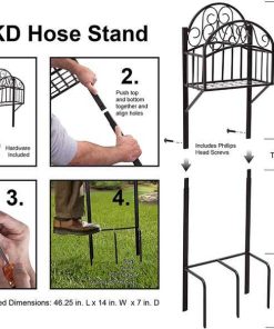 - Hose stand with convenient storage shelf for frequently used garden tools