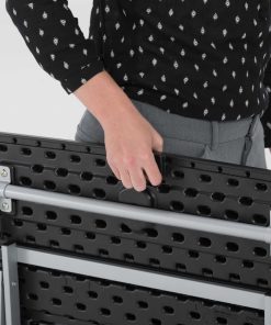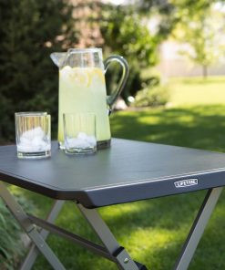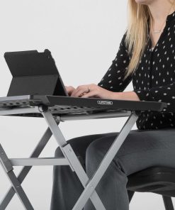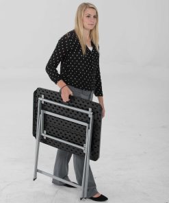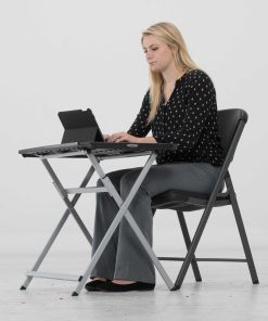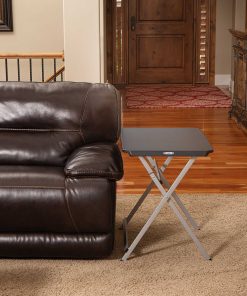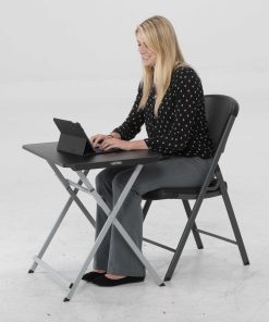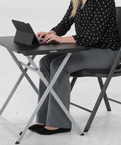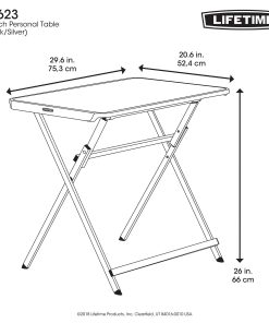 30-Inch Personal Tray Table – This is a black and silver personal folding table 30 in. X 20 in. with the X-frame and a rectangle top. Lifetime 30-Inch Personal Tables are constructed of high-density polyethylene and designed for strength and stability. The wide-leg stance and brace position make the table the perfect desk height. The steel frame design folds flat for easy storage and is protected with a powder-coated, weather-resistant finish. The modern style features thin edges, rectangular tubing, and a wide foot stance for ample legroom. The tables are built for indoor or outdoor use.