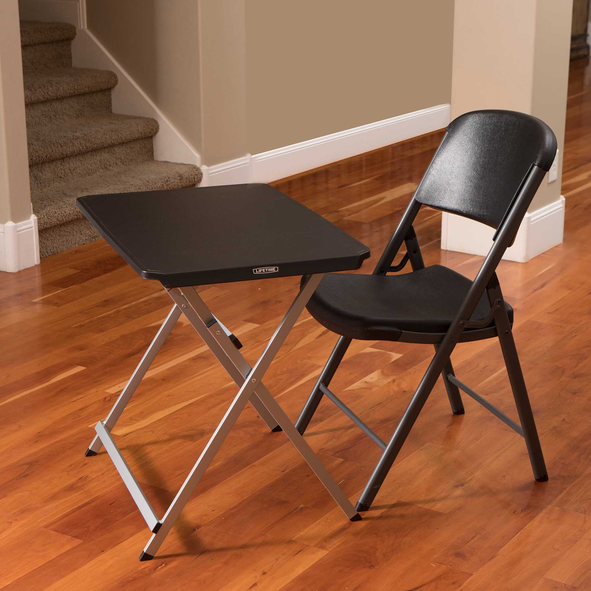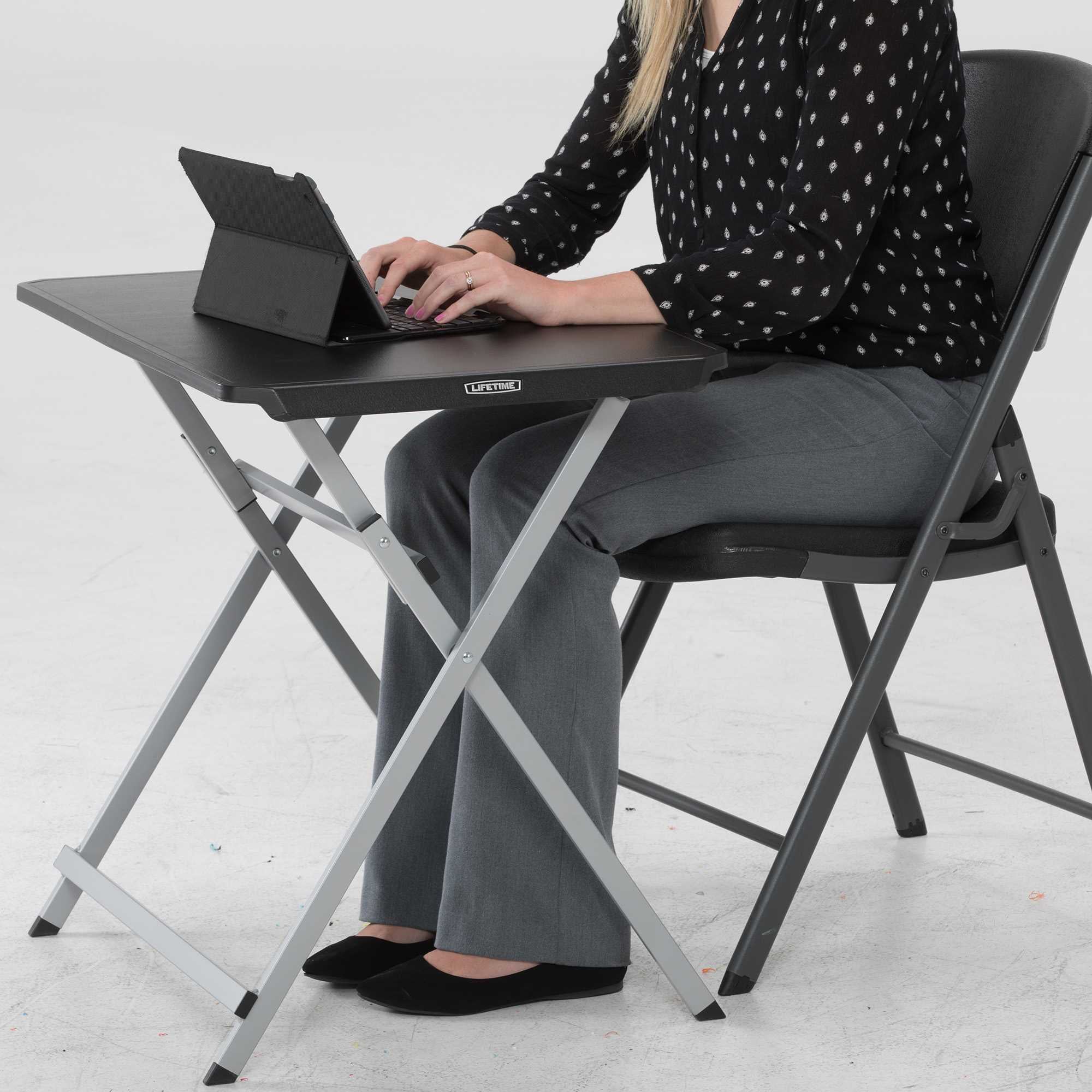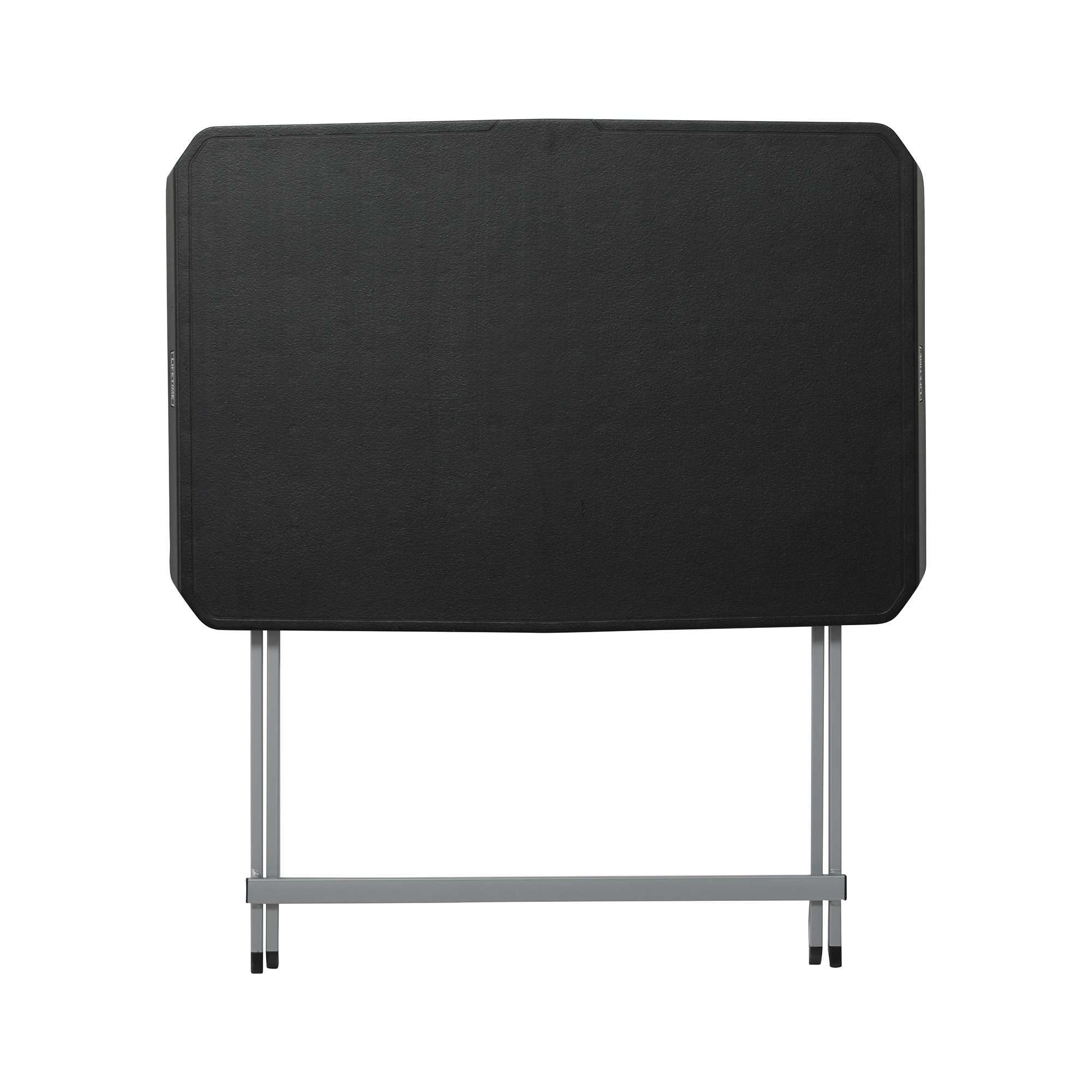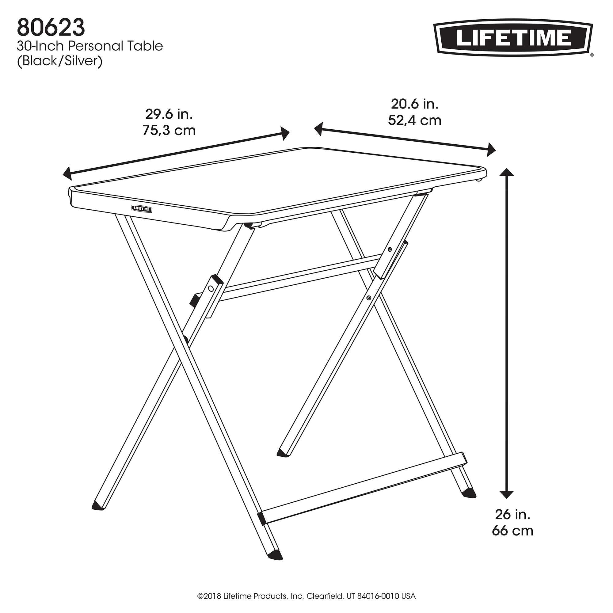30-Inch Personal Tray Table – This is a black and silver personal folding table 30 in. X 20 in. with the X-frame and a rectangle top. Lifetime 30-Inch Personal Tables are constructed of high-density polyethylene and designed for strength and stability. The wide-leg stance and brace position make the table the perfect desk height. The steel frame design folds flat for easy storage and is protected with a powder-coated, weather-resistant finish. The modern style features thin edges, rectangular tubing, and a wide foot stance for ample legroom. The tables are built for indoor or outdoor use.