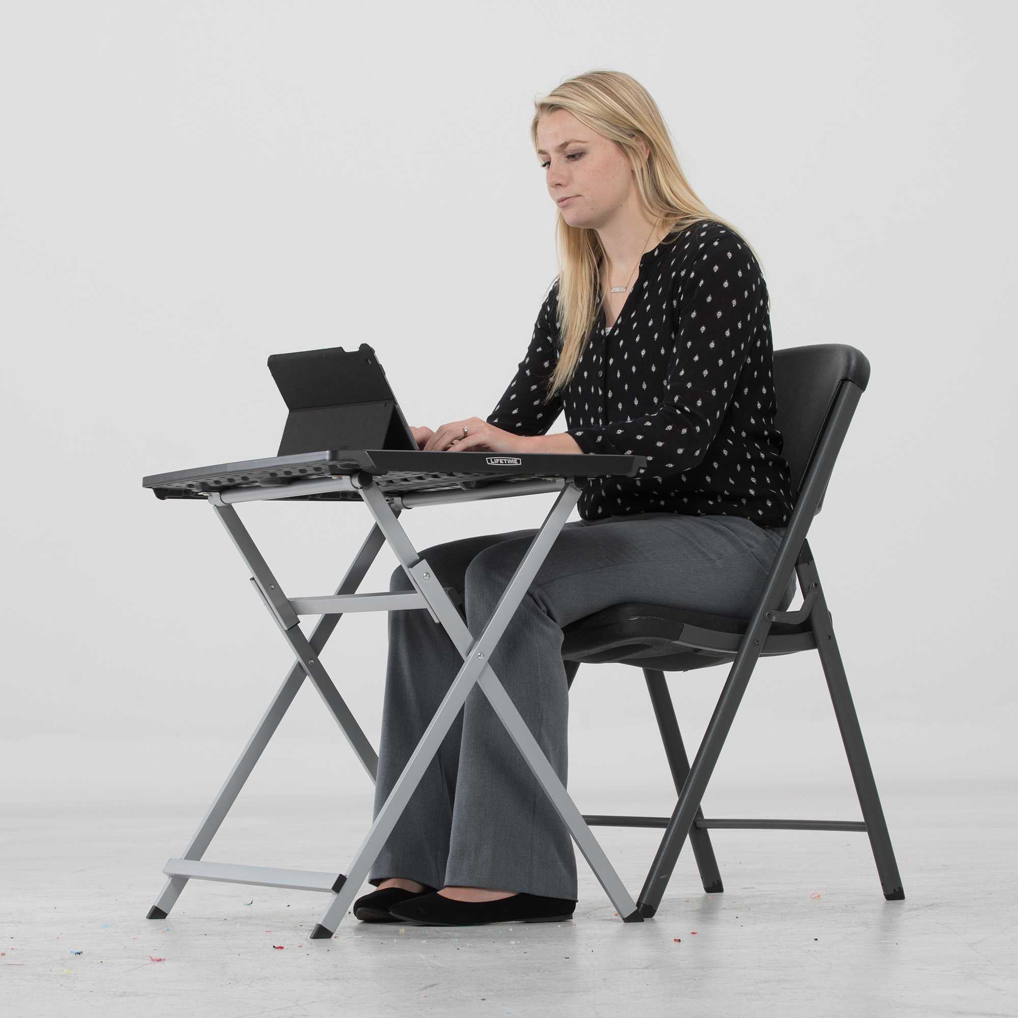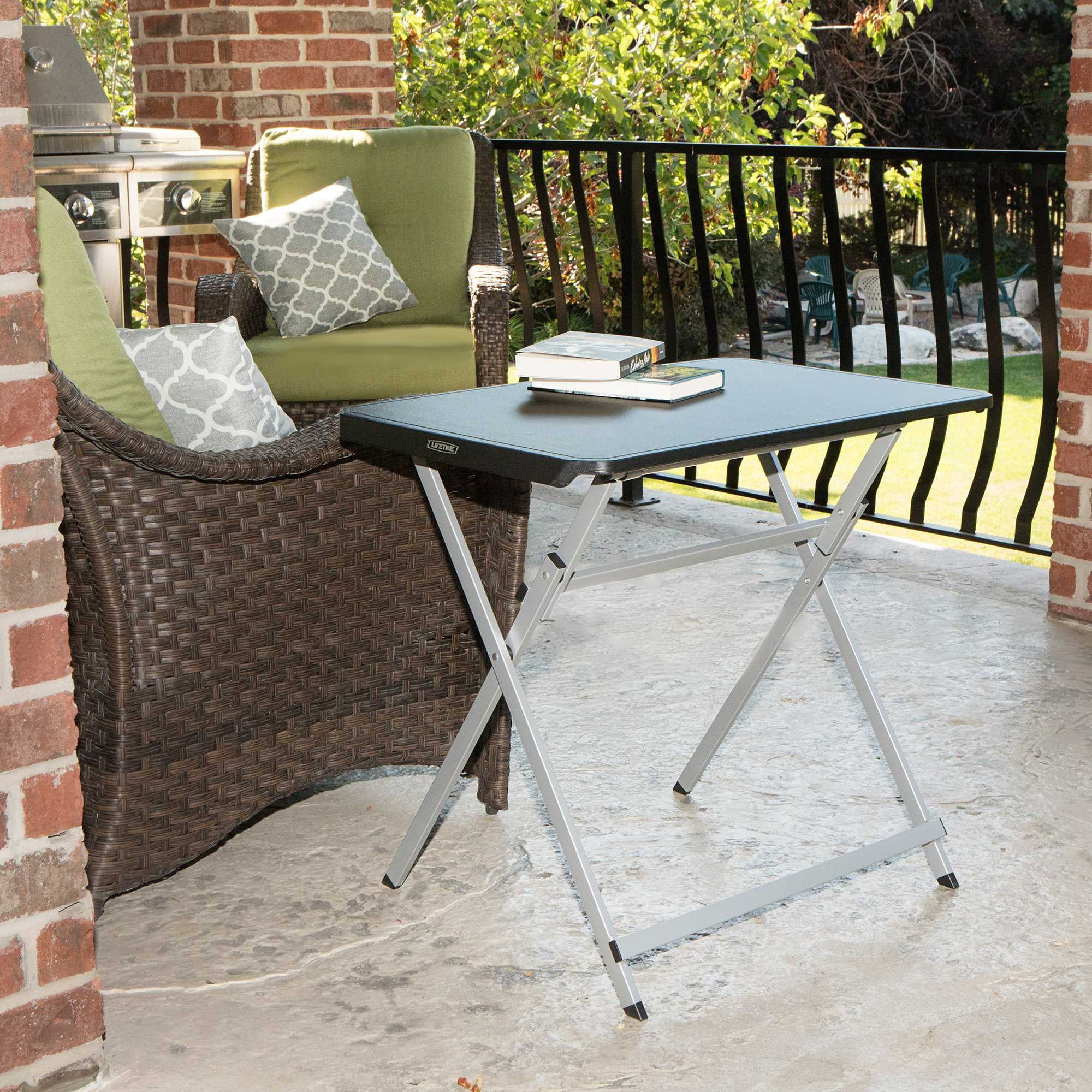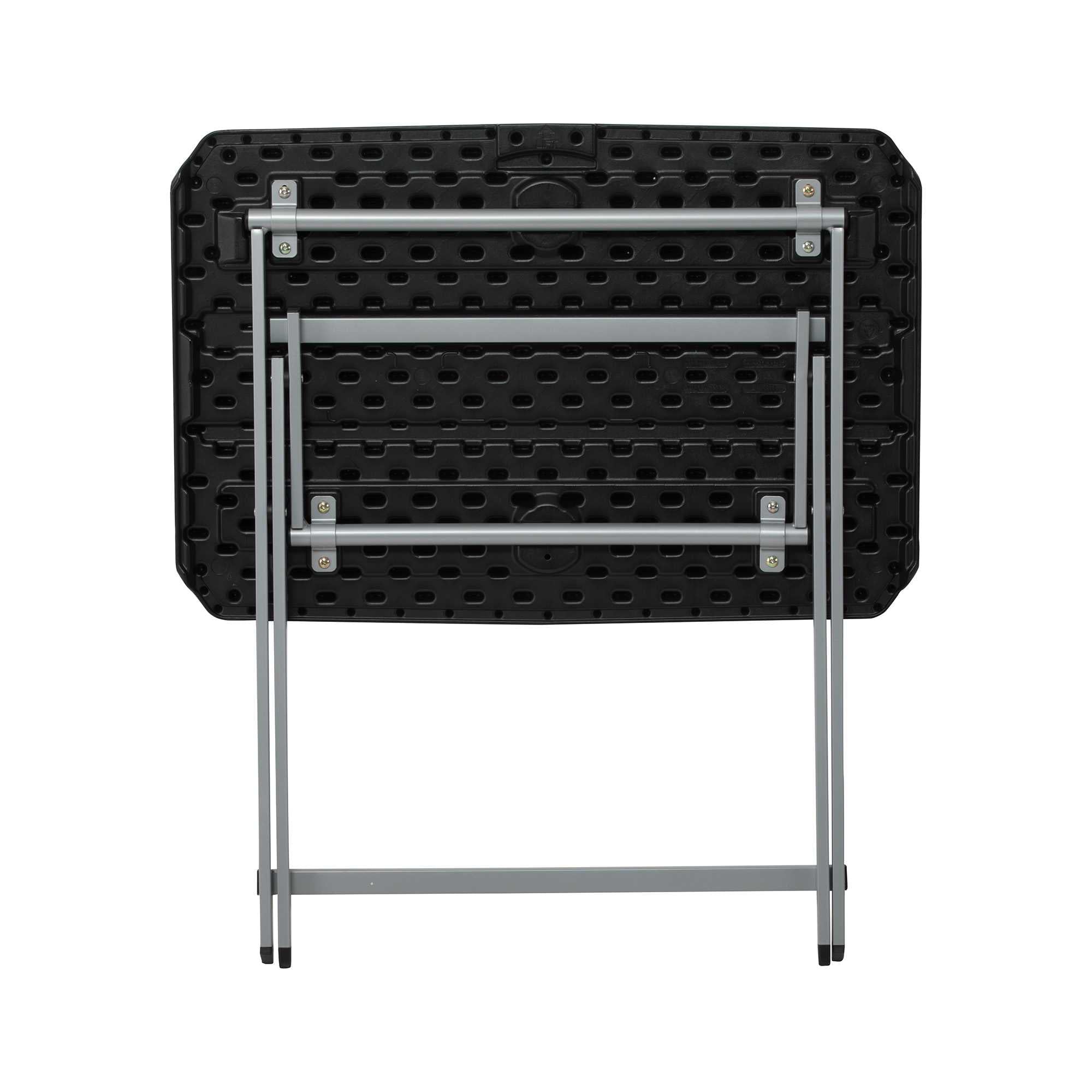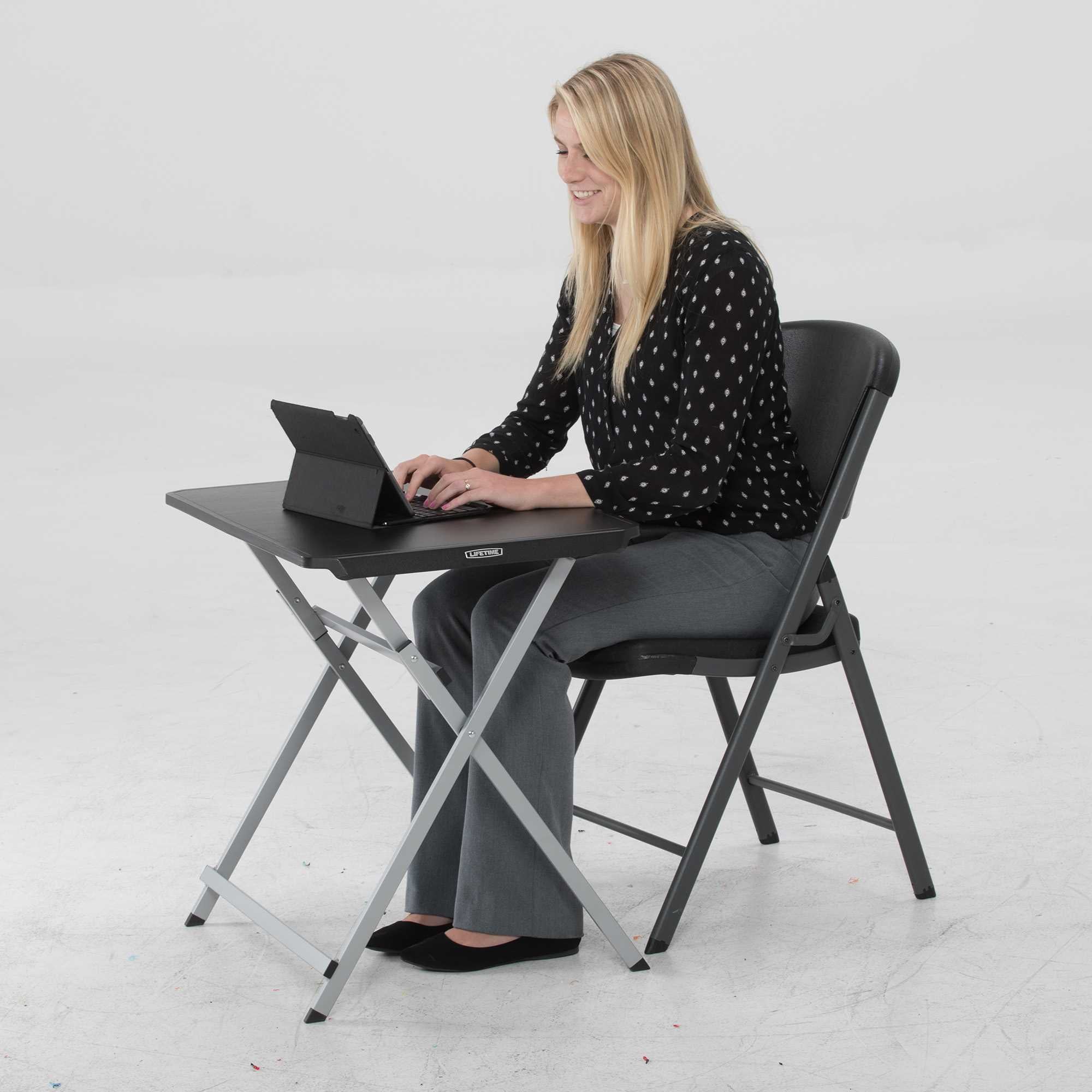 30-Inch Personal Tray Table – This is a black and silver personal folding table 30 in. X 20 in. with the X-frame and a rectangle top. Lifetime 30-Inch Personal Tables are constructed of high-density polyethylene and designed for strength and stability. The wide-leg stance and brace position make the table the perfect desk height. The steel frame design folds flat for easy storage and is protected with a powder-coated, weather-resistant finish. The modern style features thin edges, rectangular tubing, and a wide foot stance for ample legroom. The tables are built for indoor or outdoor use.