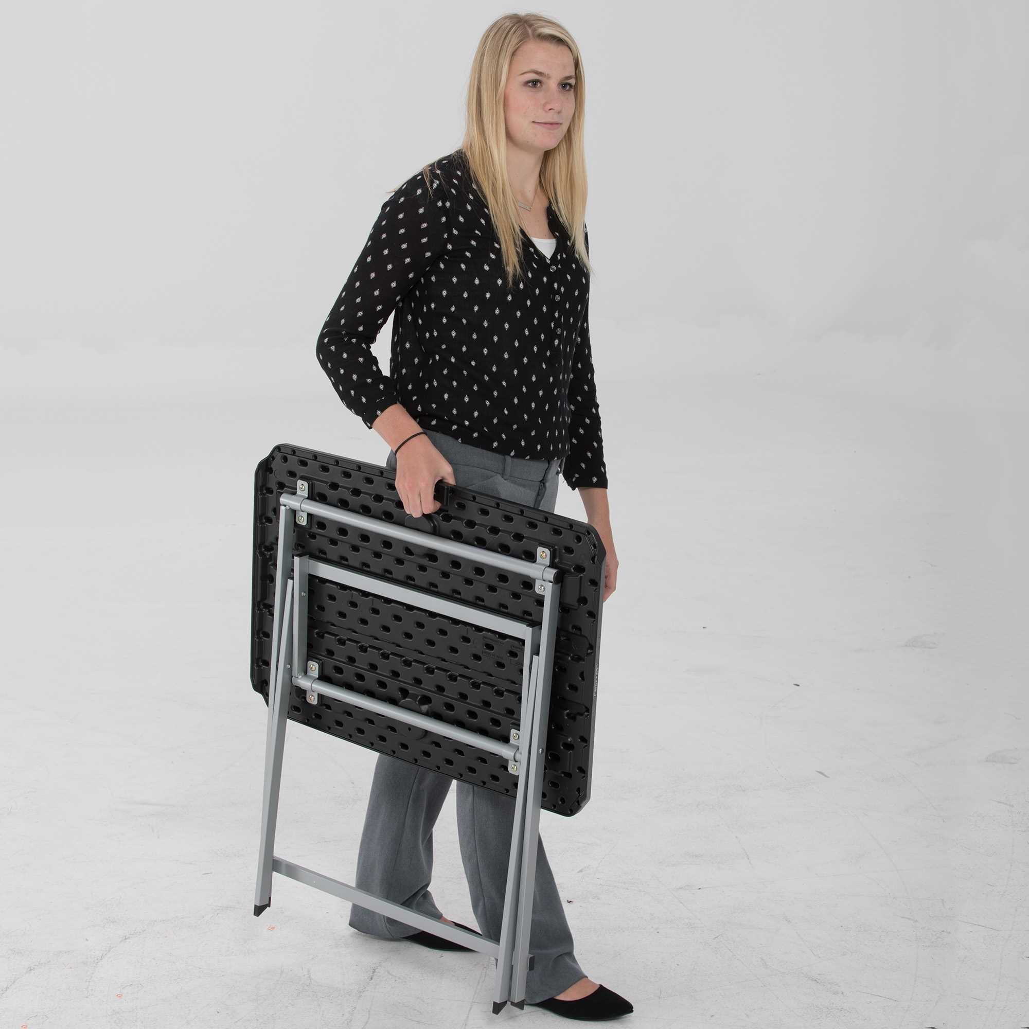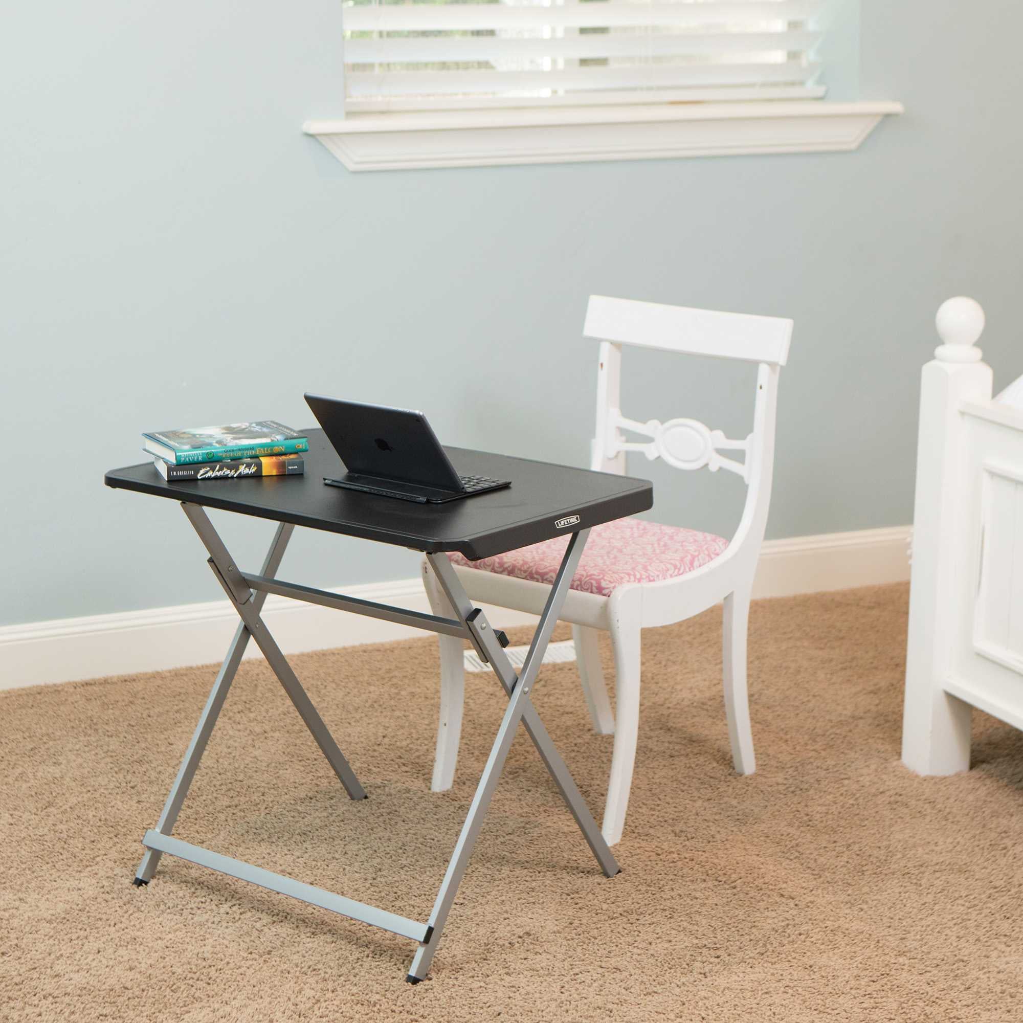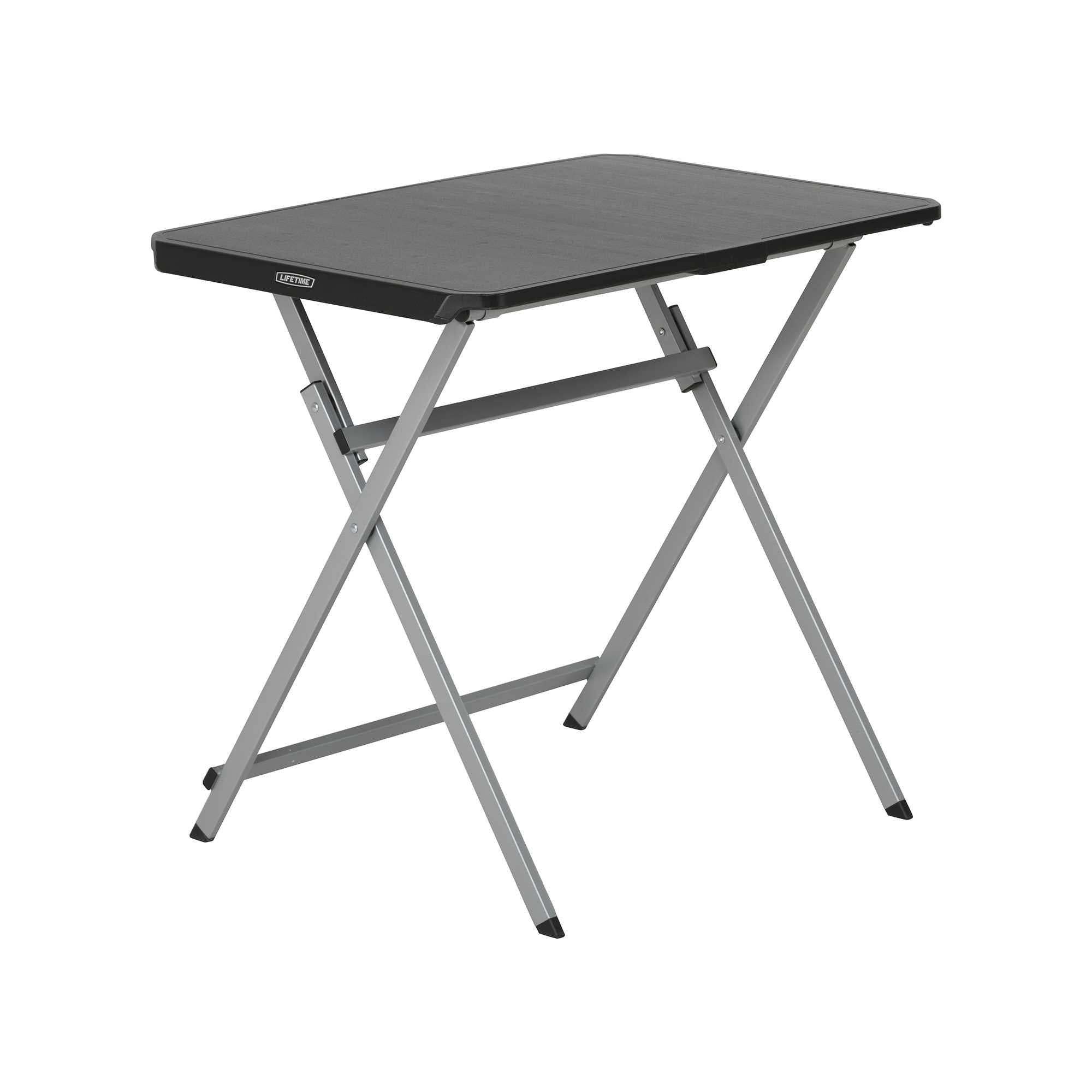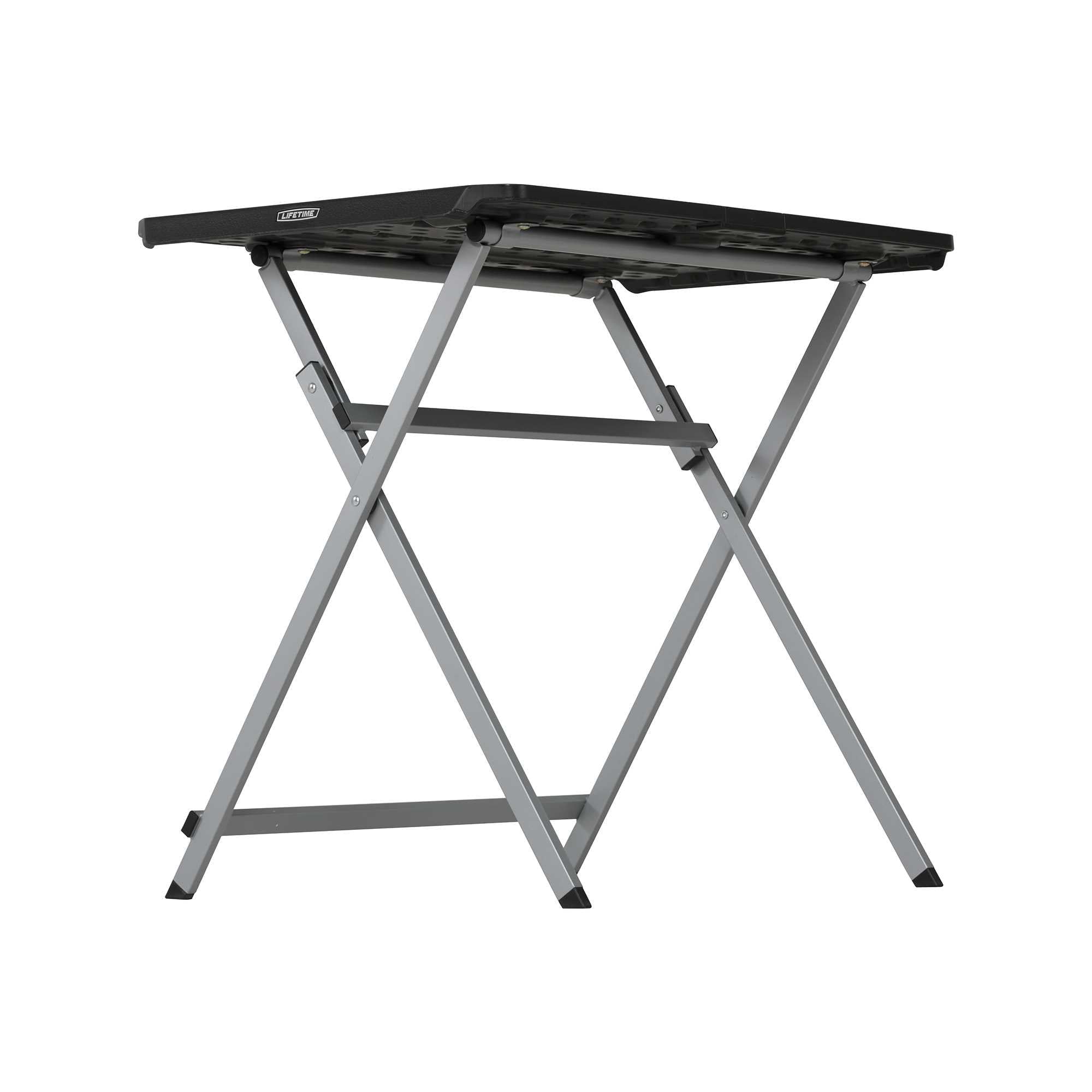 30-Inch Personal Tray Table – This is a black and silver personal folding table 30 in. X 20 in. with the X-frame and a rectangle top. Lifetime 30-Inch Personal Tables are constructed of high-density polyethylene and designed for strength and stability. The wide-leg stance and brace position make the table the perfect desk height. The steel frame design folds flat for easy storage and is protected with a powder-coated, weather-resistant finish. The modern style features thin edges, rectangular tubing, and a wide foot stance for ample legroom. The tables are built for indoor or outdoor use.