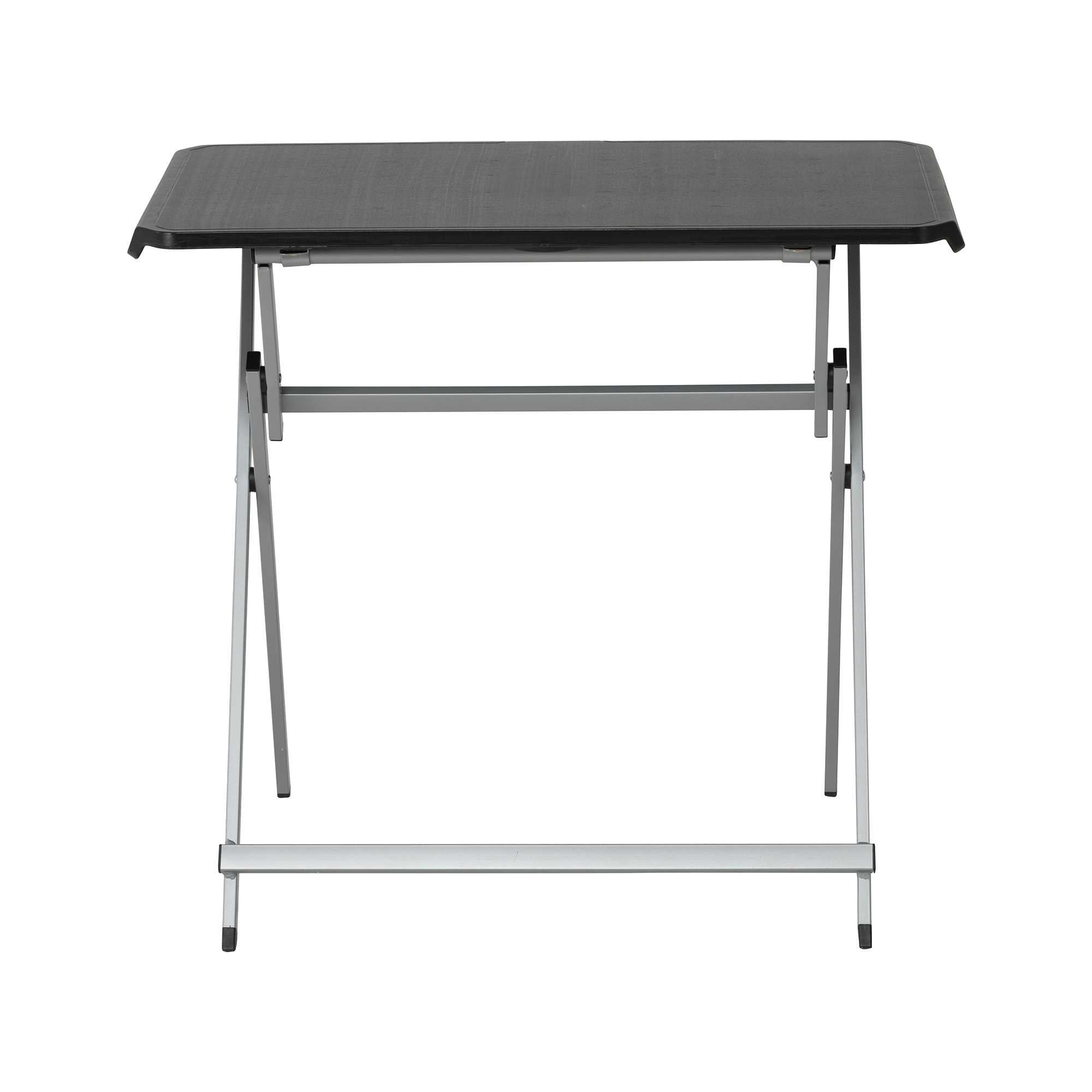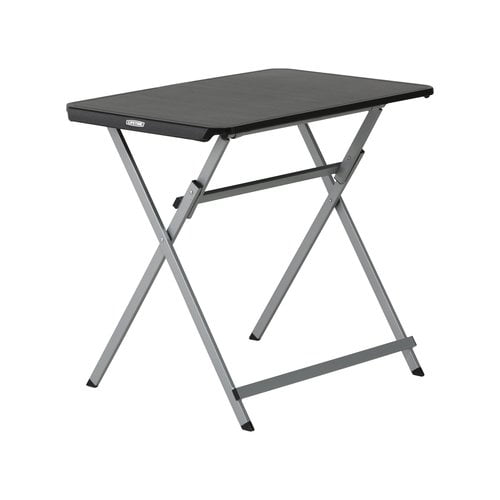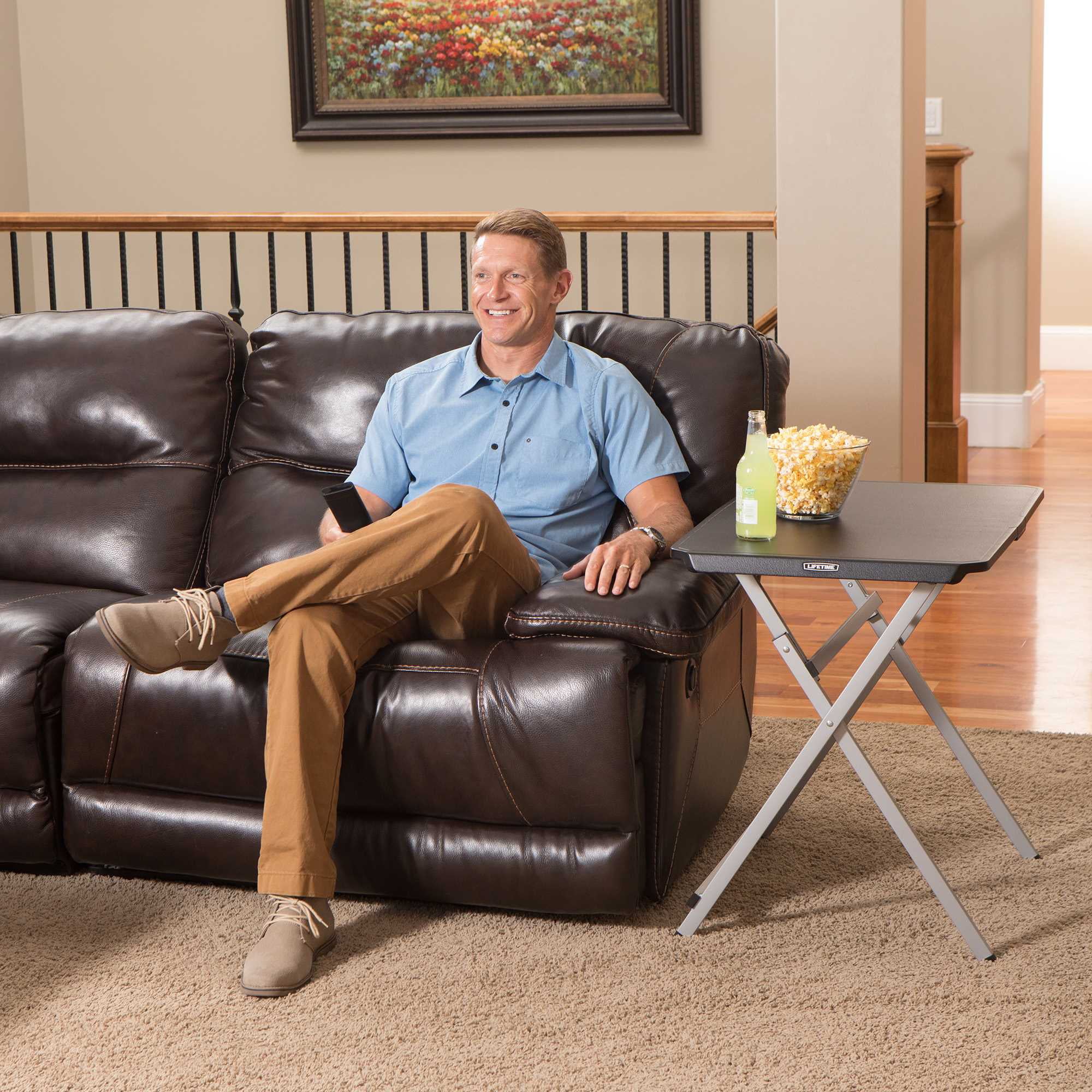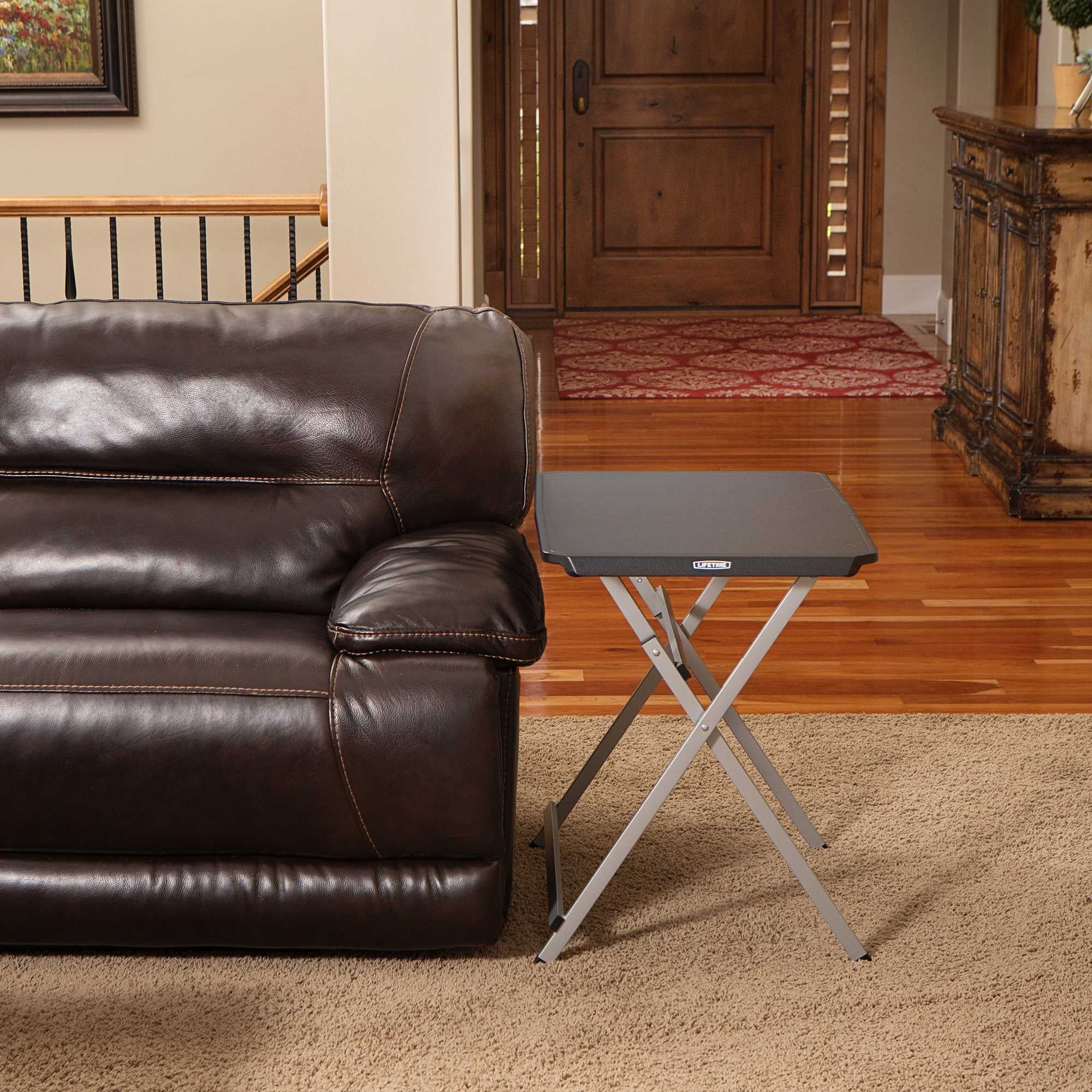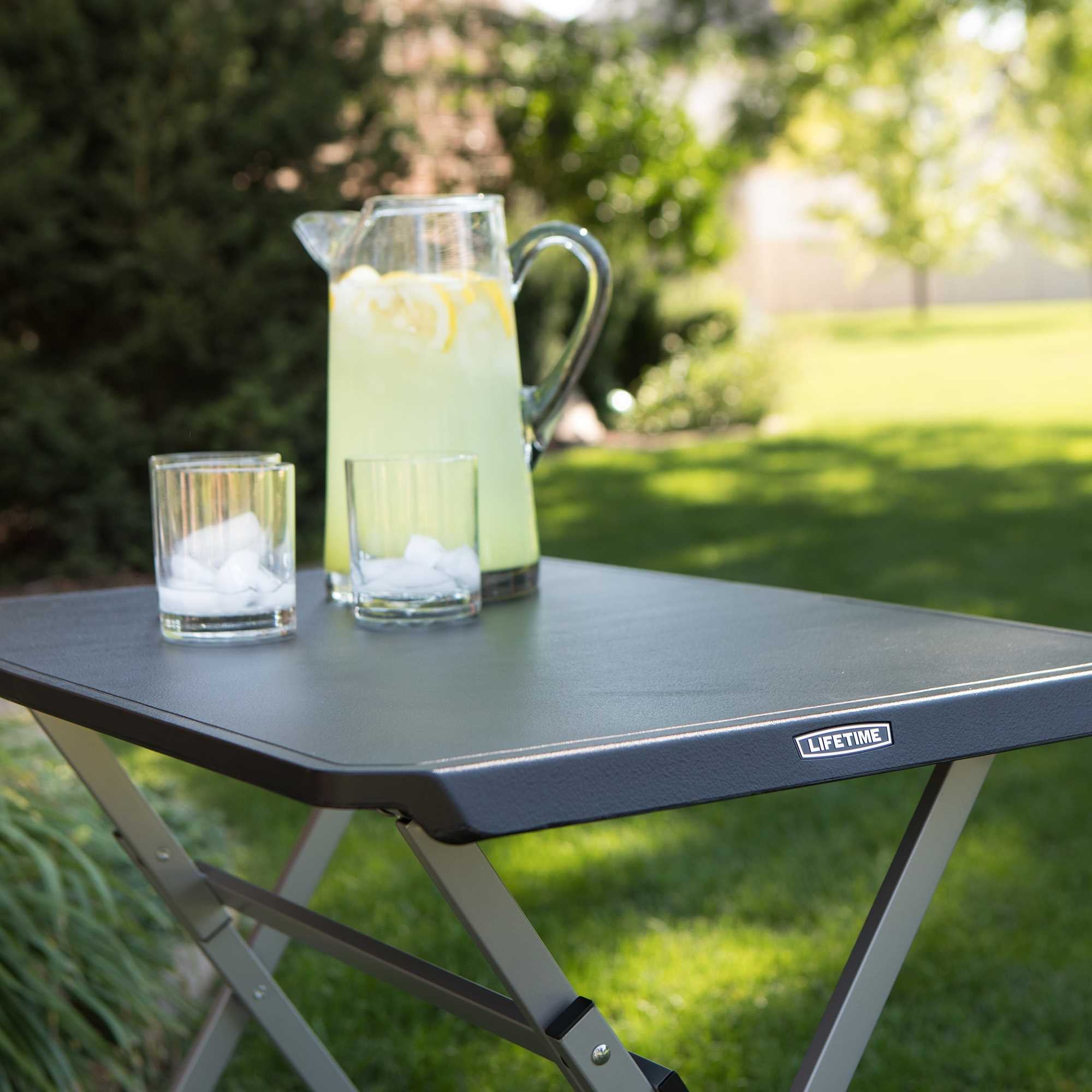 30-Inch Personal Tray Table – This is a black and silver personal folding table 30 in. X 20 in. with the X-frame and a rectangle top. Lifetime 30-Inch Personal Tables are constructed of high-density polyethylene and designed for strength and stability. The wide-leg stance and brace position make the table the perfect desk height. The steel frame design folds flat for easy storage and is protected with a powder-coated, weather-resistant finish. The modern style features thin edges, rectangular tubing, and a wide foot stance for ample legroom. The tables are built for indoor or outdoor use.