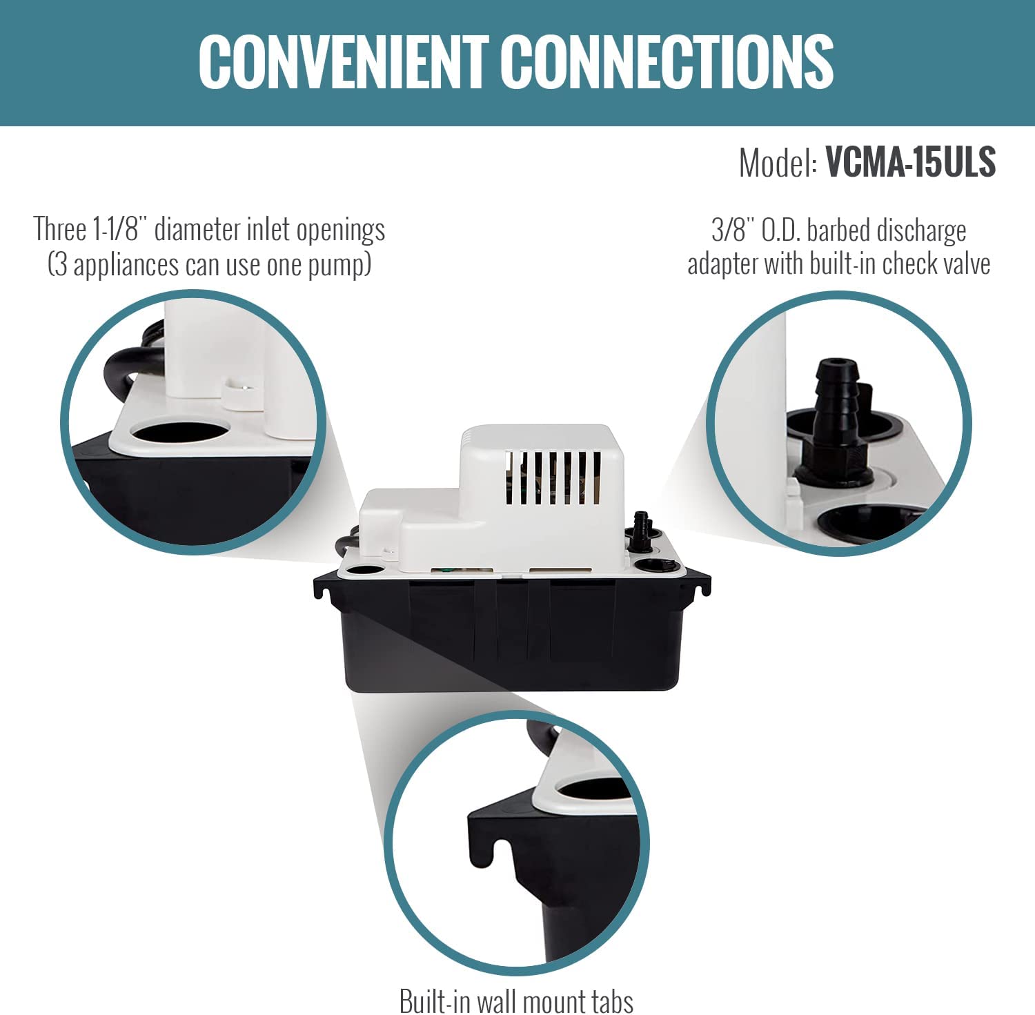 - AUTOMATIC HVAC PUMP: Ideal for collecting, detecting, and automatic removal of condensate from air conditioning equipment, dehumidifiers, high efficiency furnaces, condensing boilers, and other equipment where an automatic drain pump is required