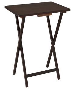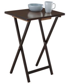 Mainstays 5-Piece Walnut Folding Tray Table offers a quick and stylish side table wherever extra table space is needed, while thoughtfully designed to effortlessly fold away conveniently when not in use. It easily folds flat and can be stored on an ultra-handy storage tray conveniently when not in use. Constructed from solid rubberwood and boast a classic natural finish sure to complement any decor scheme and color story. This table not only provides ample room to keep things within reach but also works perfectly as a quick pop-up table to serve extra drinks and snacks. It is also the perfect addition to dorm rooms or smaller living spaces. Use Mainstay Tray Table to instantly create a desk, small kitchen table and work surface, meals by the television. Its sleek design can also fit in with many styles of decor, a perfect choice for every home.