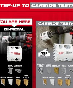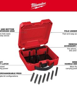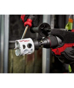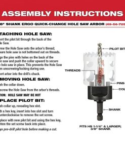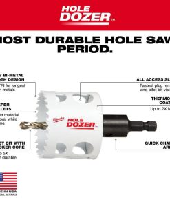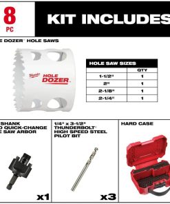 (1) 1-1/2 in. hole dozer bi-metal hole saw (49-56-9617), (1) 2 in. hole dozer bi-metal hole saw (49-56-9624), (1) 2-1/8 in. hole dozer bi-metal hole saw (49-56-9626), (1) 2-1/4 in. hole dozer bi-metal hole saw (49-56-9628), (1) large thread arbor (49-56-7250), (3) pilot bit