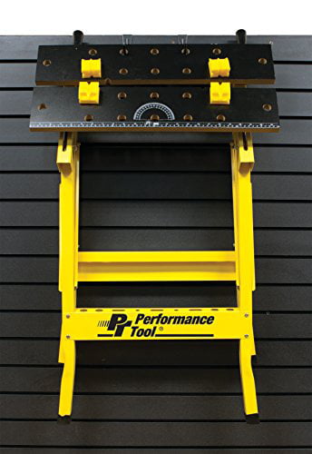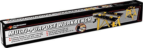 The Performance W54025 Multi-Purpose Workbench can be used to hold work pieces safely in place while working with them. The four bench dogs of the W54025 Workbench enable it to hold odd shaped workpieces in place without damaging their surfaces. The W54025 Workbench can also allow for cuts or holes to be made in workpieces with an open space under it, eliminating the worry of damaging surfaces underneath. Features: Folding design allows for easy storage without taking up much space Includes 4 bench dogs for holding odd shaped pieces Tabletop printed with grid, ruler and protractor for added convenience Includes tool storage rail to keep tools withing easy reach but out of the way 200-Pounds safe working load capacity Overall size: 23-7/8 x 25 x 31 in.