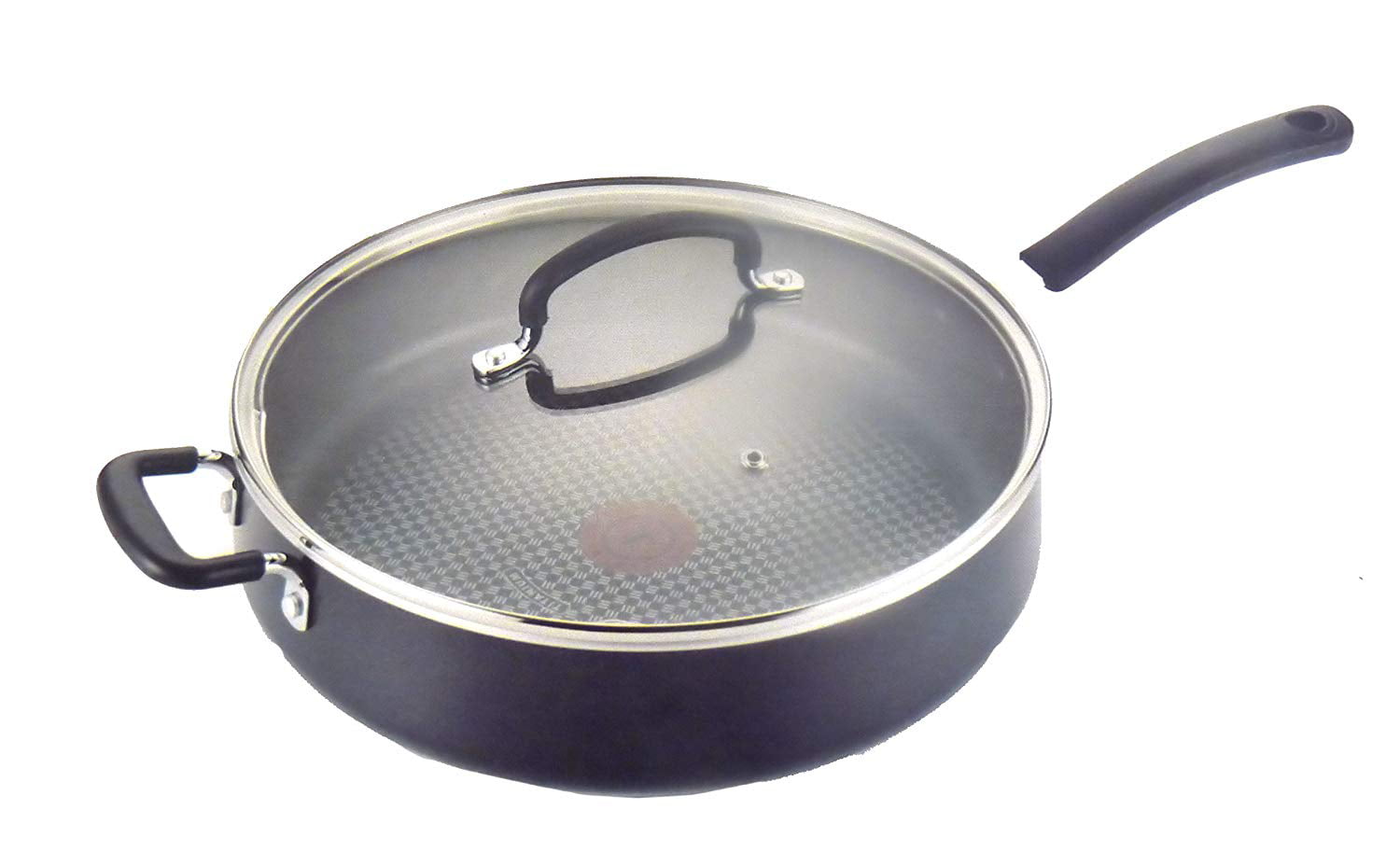 T-fal 5.5-quart Jumbo Cooker with Lid-The Titanium nonstick cooking surface is metal utensil safe and made for years of excellent performance. The unique Thermo-Spot heat indicator assures that the pan is properly preheated to seal in the flavor of foods. The base provides even heating for reliable cooking results every time.