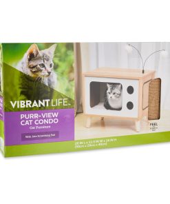 Our Vibrant Life Purr-View Cat Condo is a playful and stylish cat condo that would make the perfect addition to your home decor. The Vibrant Life Purr-View Cat Condo features a lovely design of high-quality laminated wood shaped into a retro TV. It comes complete with a jute fabric scratching pad that helps in keeping your cat’s claws trimmed and healthy and a soft, plush, removable and washable mat that is comfortable for your cat and will make the cleaning process easier for you. Plus, the toy antennae on the top complete the look while providing your cat with hours of playtime. All the incredible features and unique design included in the Vibrant Life Purr-View Cat Condo will provide your feline friend the ideal space to sleep, play, and exercise all in on.